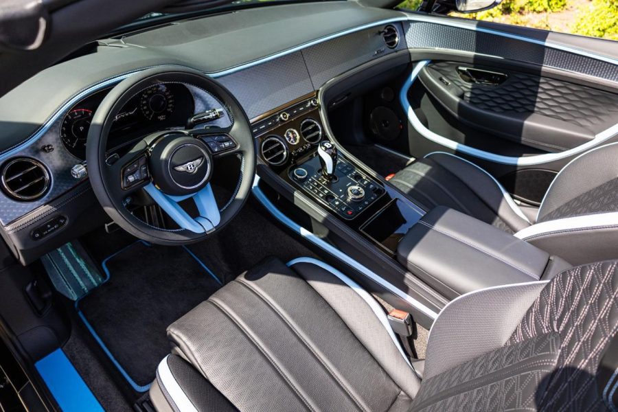 The interior features hand-stitched leather seats with multiple adjustments, including heating and ventilation options. Wood veneer and polished metal trims enhance the cabin’s premium feel.