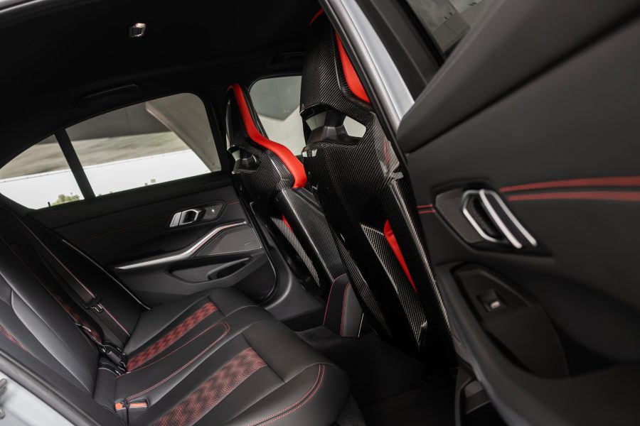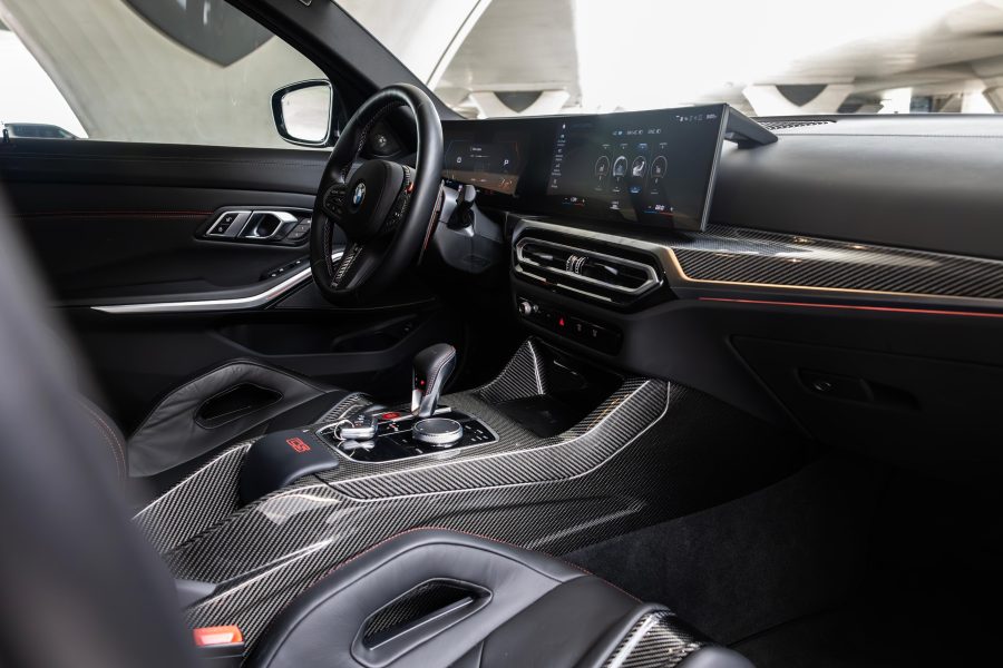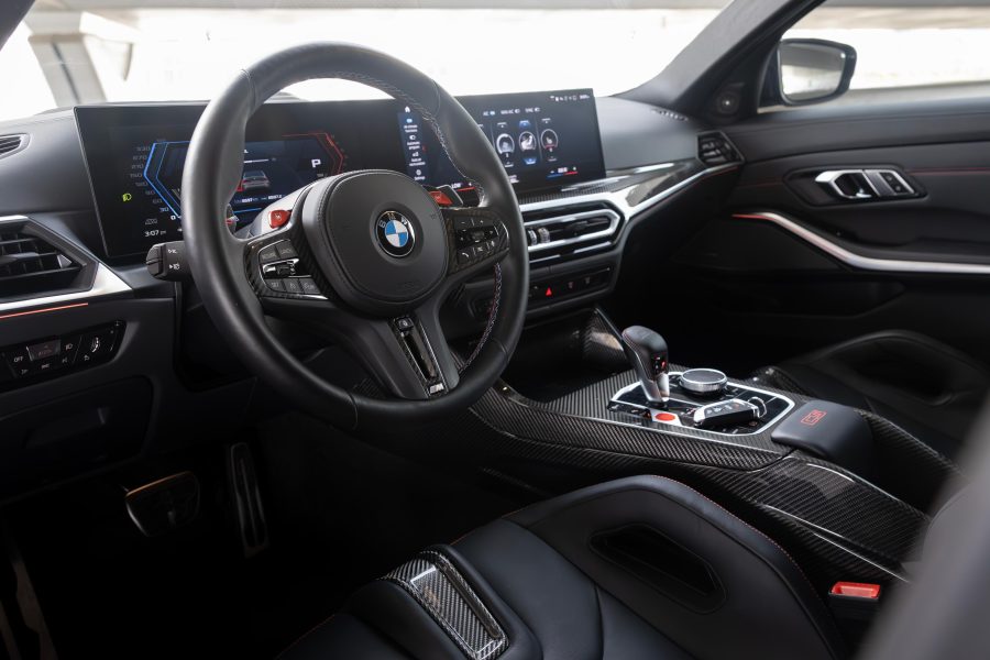 Inside, the M3 CS combines sportiness with luxury. It features Merino leather upholstery with contrast stitching and carbon fiber trim on the dashboard and center console.