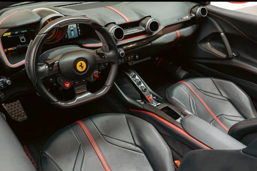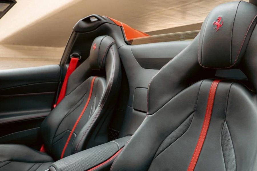 The Ferrari 812 GTS offers a driver-focused cockpit designed for ease of use, with controls logically arranged on the central console. Its sport seats are covered in ventilated leather to balance comfort and support.