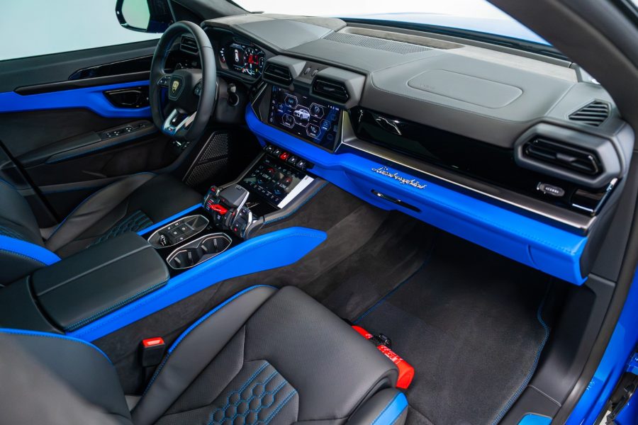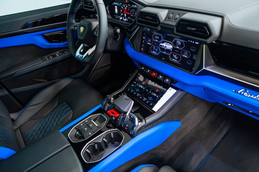 The Lamborghini Urus merges powerful performance with a customized, opulent interior. The cabin features striking elements such as: