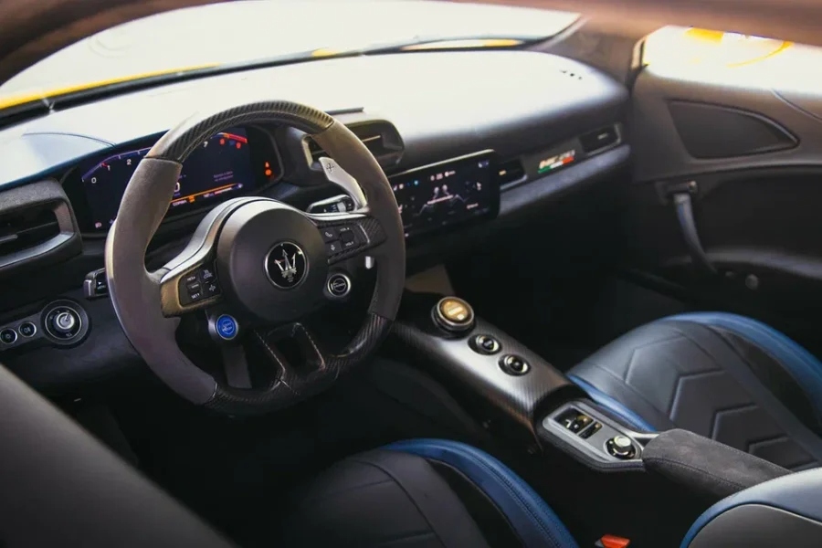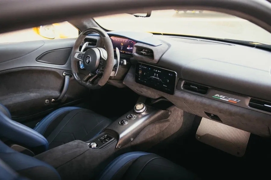The interior of the MC20 focuses on driver comfort and refinement. It features premium materials like fine leather and Alcantara, paired with a sleek, minimalist design to reduce distractions. The seating supports the driver ergonomically, ensuring comfort during extended drives.